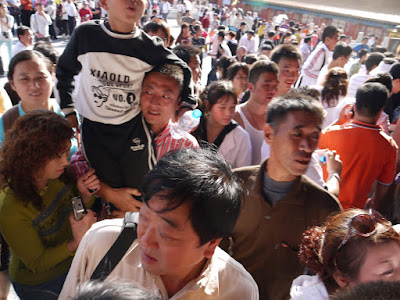 On our last day, we and along with half of China are lined up to get into the Forbidden City. We have to remind ourselves the pushing, the shoving, the free for alls, the apparent dis-courteousness is anything but. At one of the temples, masses of people press into the barrier to get the shot of the Empresses’ throne. It is a pick-pocketers’ delight as bodies are locked together, arms with digicams held high, shouts and hollers. Free iPhones couldn’t render such bedlam. I’m more interested in pix of the locals. I’m awed by the normality of the chaos and also love how they typically pose as if they are facing a firing squad, or are doing a GQ or Vanity Fair shoot.