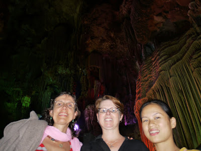 They bought a Chinese-built SUV. It’s extraordinarily rare to see a foreigner drive, so heads turn. Together the four of us have barreled through the countryside, floated down the lazy river, became totally awed inside the netherworld Silver Caves (see pix), and held our noses through the market (dog meat, eels, rabbits, etc). Dog meat I’m told is not widely eaten, tho it isn’t distinguishable from other meats. And the markets….organized bedlam with everything for sale….traditional meds, sparkling produce, rows upon rows of flesh, live animals, hardware, eateries. Trish is of course about the only white meat going around, but she’s not for sale. I almost killed her the other day when she went solo on the local sardine bus with our new laptop in a tote bag—silly monkey.