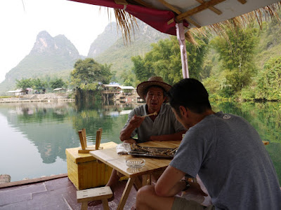Now in Yangshuo, the land of surreal, karst-like limestone peaks rising out of nowhere and everywhere. Our digs (River Retreat) are set in idyllic rural and poor China, outside of the town, overlooking the famous Li River (which the bamboo forests obscure). We are amidst mud brick homes, with pig manure in the air, chickens scurrying about, hummingbirds darting everywhere, rice terraces and water buffaloes and the soothing sounds of birds and crickets instead of the distant din of the town across the river. Although this being China, firecrackers and or fireworks happen almost nightly and we actually set alight a fire balloon of our own and watched it drift towards the full the moon.